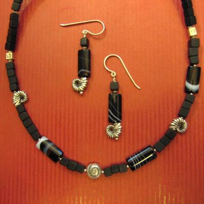 |  Kette und Ohrhänger925 Silber, Onyx, Bandachat